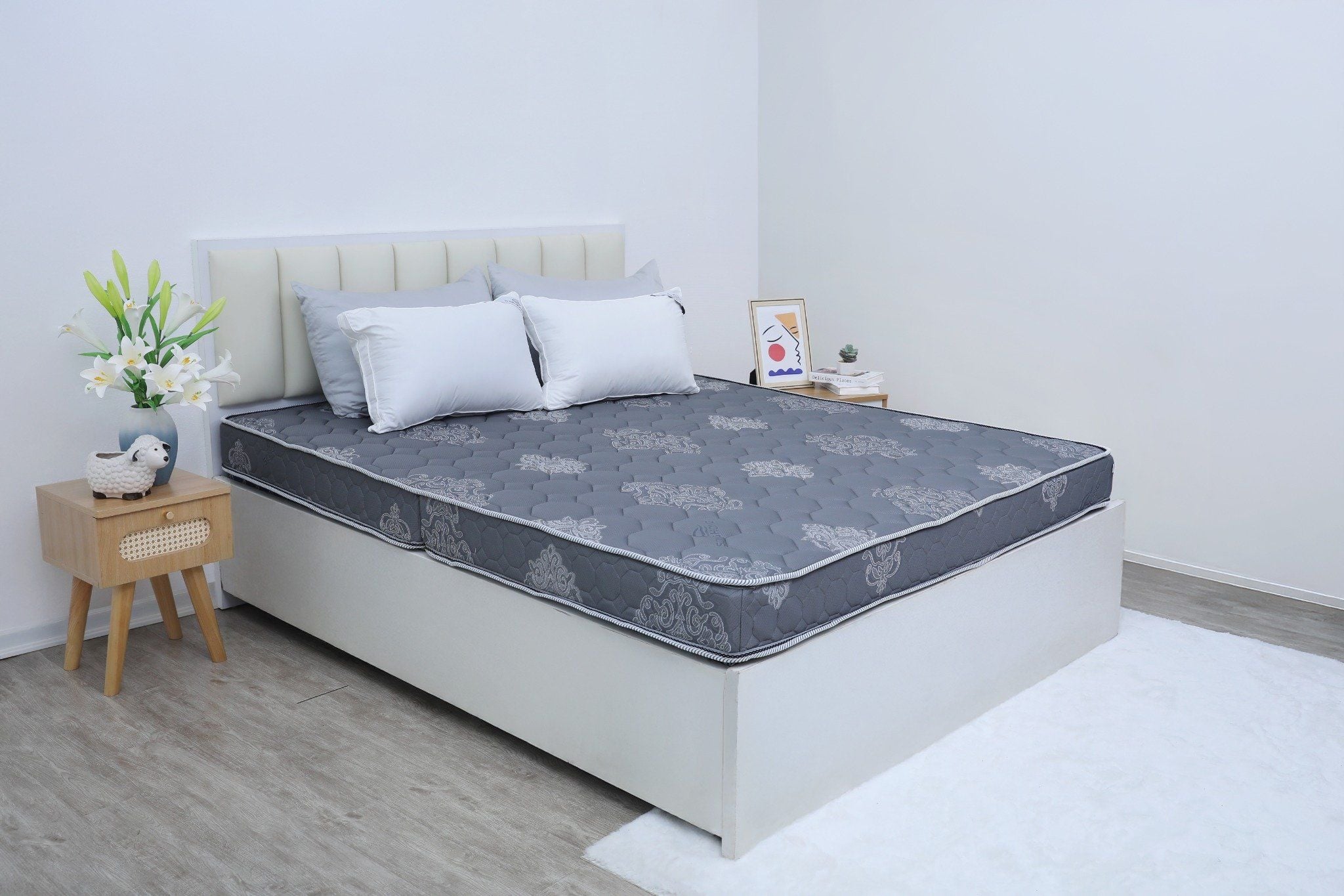 - Vỏ đệm: mầu sắc trang nhã, họa tiết nhã nhặn. Vải Viscose thông thoáng, hút ẩm được chần kết hợp cùng lớp bông kháng khuẩn giúp khử mùi, đảm bảo bề mặt đệm luôn khô thoáng.